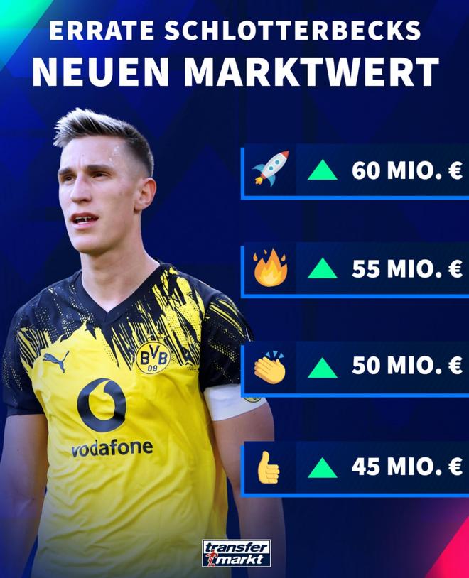德转即将对德甲球员的身价进行更新。今日德转预热多特后卫施洛特贝克身价,球员最高从4000万欧涨至6000万欧。