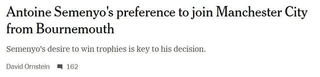安托万·塞门约的转会争夺已经结束,据「竞技网」的权威专家大卫·奥恩斯坦报道,塞门约已经告诉曼联和曼城,他希望在1月份冬季转会窗加盟曼城。塞门约希望赢得奖杯,这是他选择瓜迪奥拉球队的关键原因。2018年以来,瓜帅的球队6次赢得英超冠军。